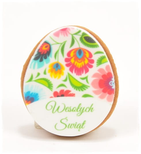 Ciasteczko miodowe w kształcie pisanki z jadalnym nadrukiem na masie cukrowej.