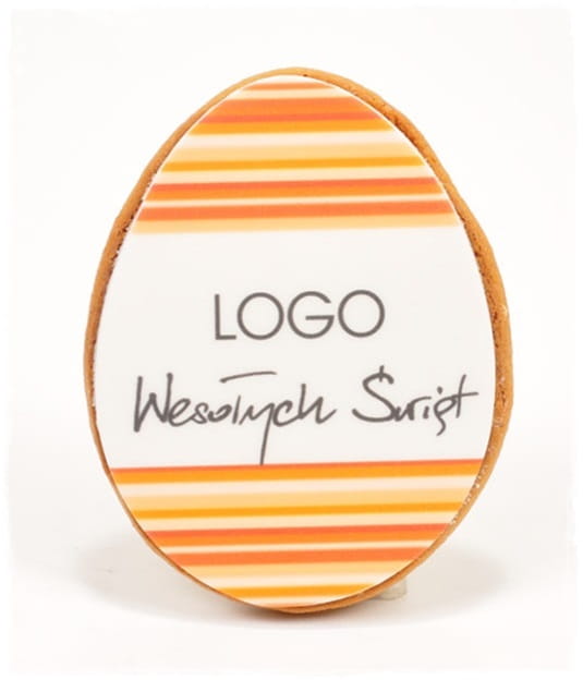 Ciasteczko miodowe w kształcie pisanki z jadalnym nadrukiem na masie cukrowej.